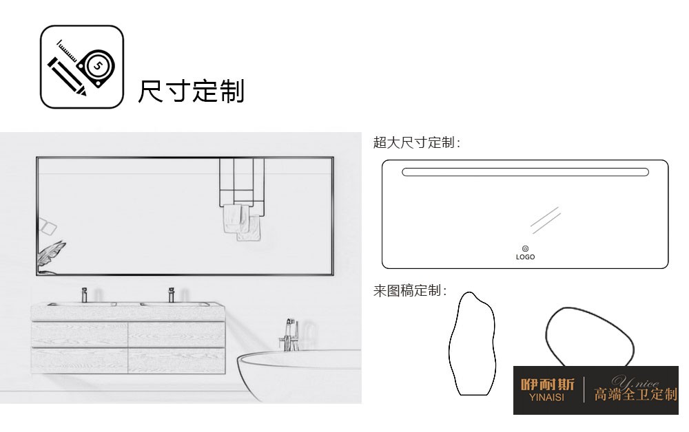 作为个性化的时代,现在的消费者再也不是曾经厂家生产什么就买什么了。现在很多消费者对于浴室镜,就提出了很多个性化的定制需求。作为专业的浴室镜厂家,咿耐斯提供完整的定制化设计。下面,小编从尺寸定制、形状定制、风格定制、功能定制4个方面来简单说说智能浴室镜的专业定制,详情如下: